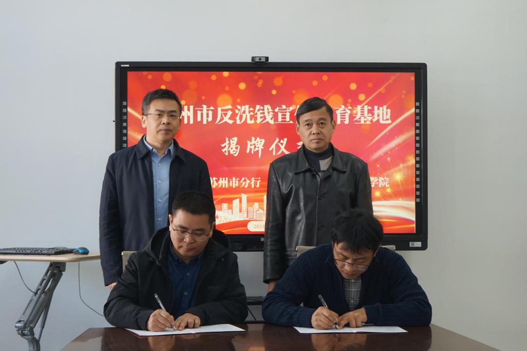 杭华良与董现珠代表双方共同签订《反洗钱宣传教育合作备忘录》,陈军与江忠华共同为苏州市反洗钱宣传教育基地揭牌。