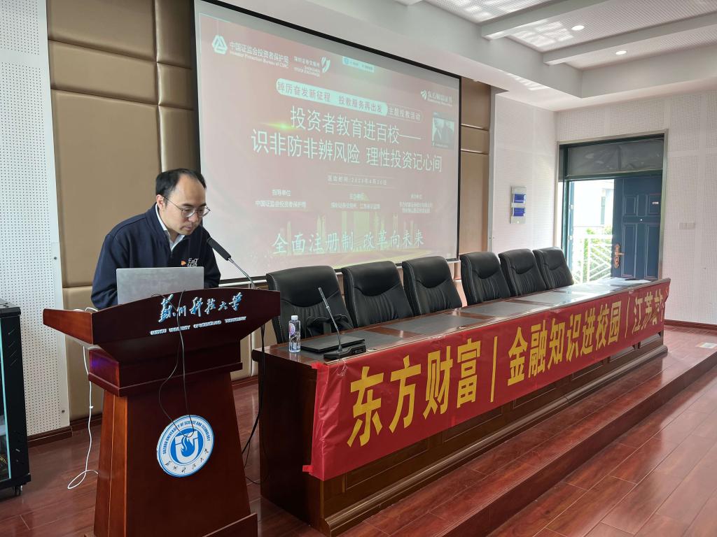 4月20日下午,伟德国际victor1946金融系在学术报告厅举办了“金融育才雏鹰计划系列”首场活动——金融知识进校园。金融系邀请东方财富证券苏州狮山路营业部法人负责人顾祝云及投资教育小组组长戴敏开展讲座,旨在激发员工学习理财投资专业知识的热情,提升金融素养。伟德国际victor1946部分师生参与本次活动。