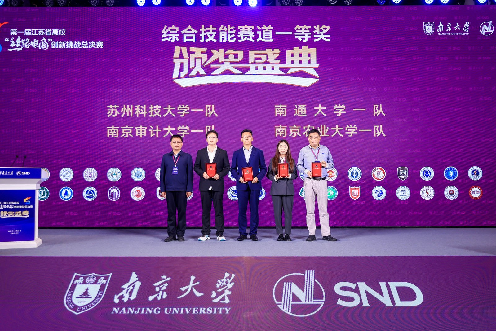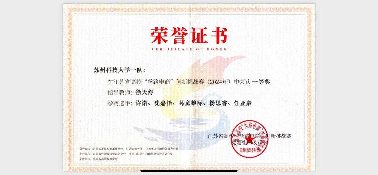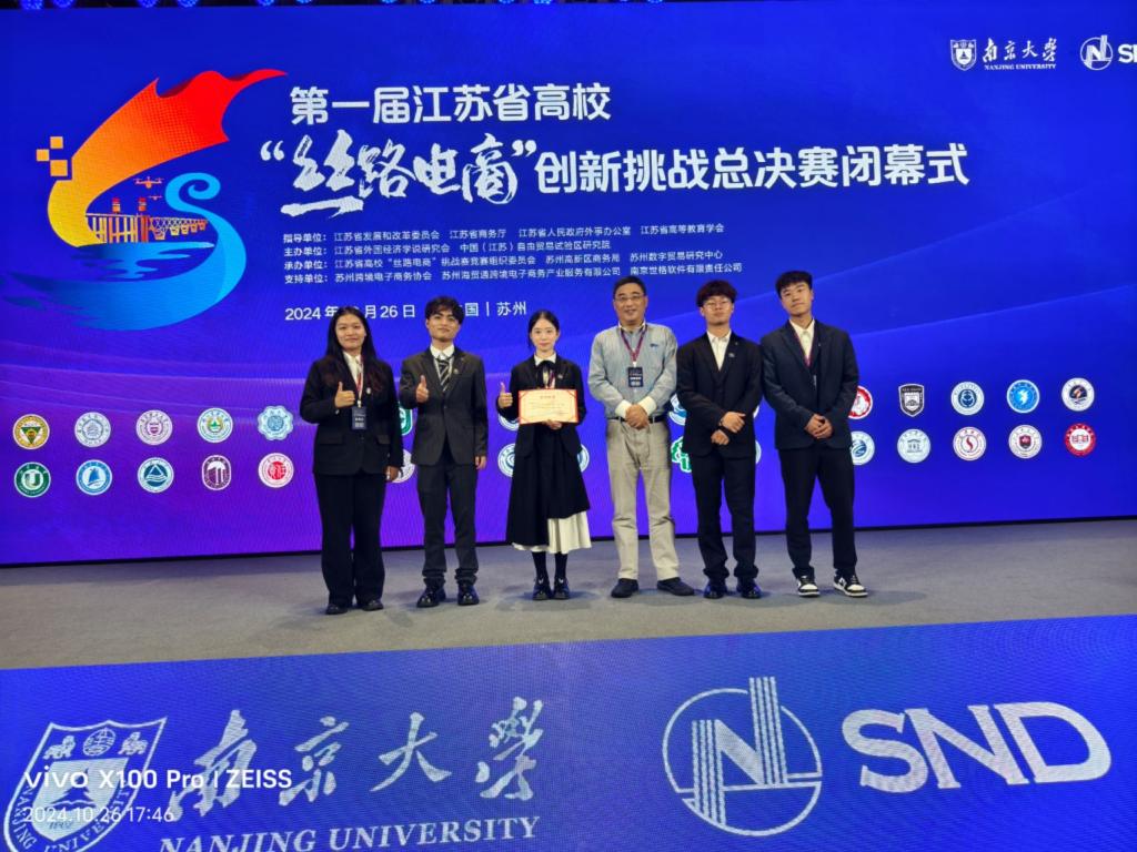 10月26日,在南京大学苏州校区举行的第一届江苏省高校“丝路电商”创新挑战总决赛中,公司徐天舒教授指导的物流国际2211级许诺、沈嘉怡、葛童雄际、杨思睿、任亚豪五位同学组成的伟德victor1946网站一队,获得综合技能赛道一等奖(未设特等奖)。