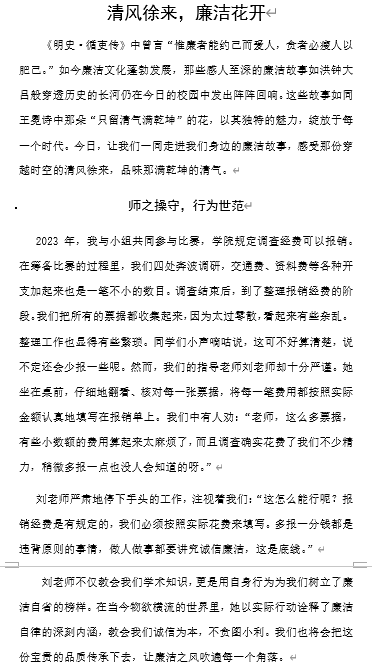此次“讲好身边的廉洁故事”征文活动的成功举办,不仅为老师和同学们提供了一个展示自我才华的舞台,更通过讲述身边的廉洁故事,让大家深刻认识到廉洁的重要性。廉洁不仅是一种行为准则,更是一种崇高的精神品质,它引领着我们在新时代的征程中勇往直前。