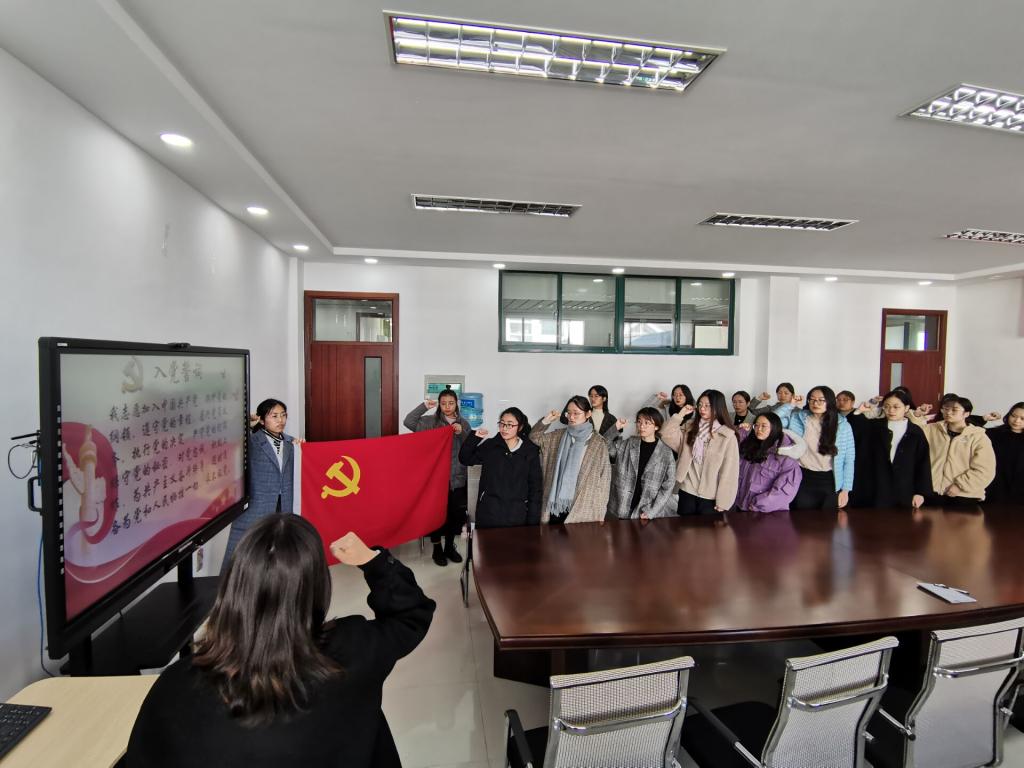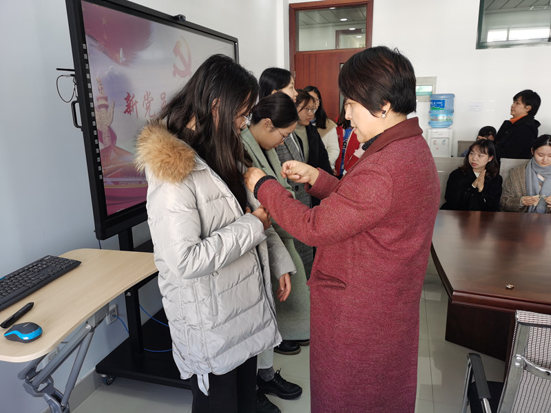 和洁宣读了2019下半年新入党党员名单,各党支部书记依次上台为新党员佩戴了党员徽章。新党员整齐站立,在领誓人的带领下,面向党旗庄严宣誓。宣誓声铿锵有力,表达了他们对党的忠诚和为共产主义事业奋斗终身的决心。金融工程员工党支部刘予辰同志代表新发展党员发言,表示将进一步严格要求自己,用行动书写青春,接受党组织的考验。